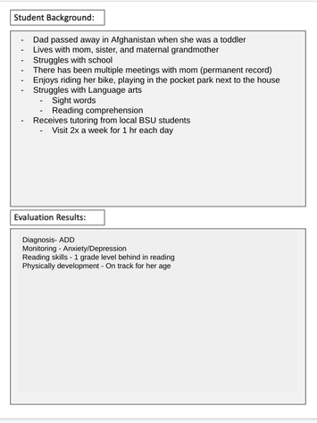 In the spring semester of 2022, in my EDUC 230 The Exceptional Child class, I participated in simulated scenario conferences. We worked in groups and we chose between 4 different scenarios. We decided to pick scenario 4 about a girl named Victoria who struggles with reading, anxiety, ADD, and slight depression. We talked about techniques that would help Victoria in her classes and at home and working more with her to help with her reading. We talked to the mother about continuing with an IEP evaluation and set up another meeting after the IEP evaluation was finished. In the second meeting, we discussed the IEP and how well Victoria was progressing throughout the techniques such as praise, staying calm, walking, etc.